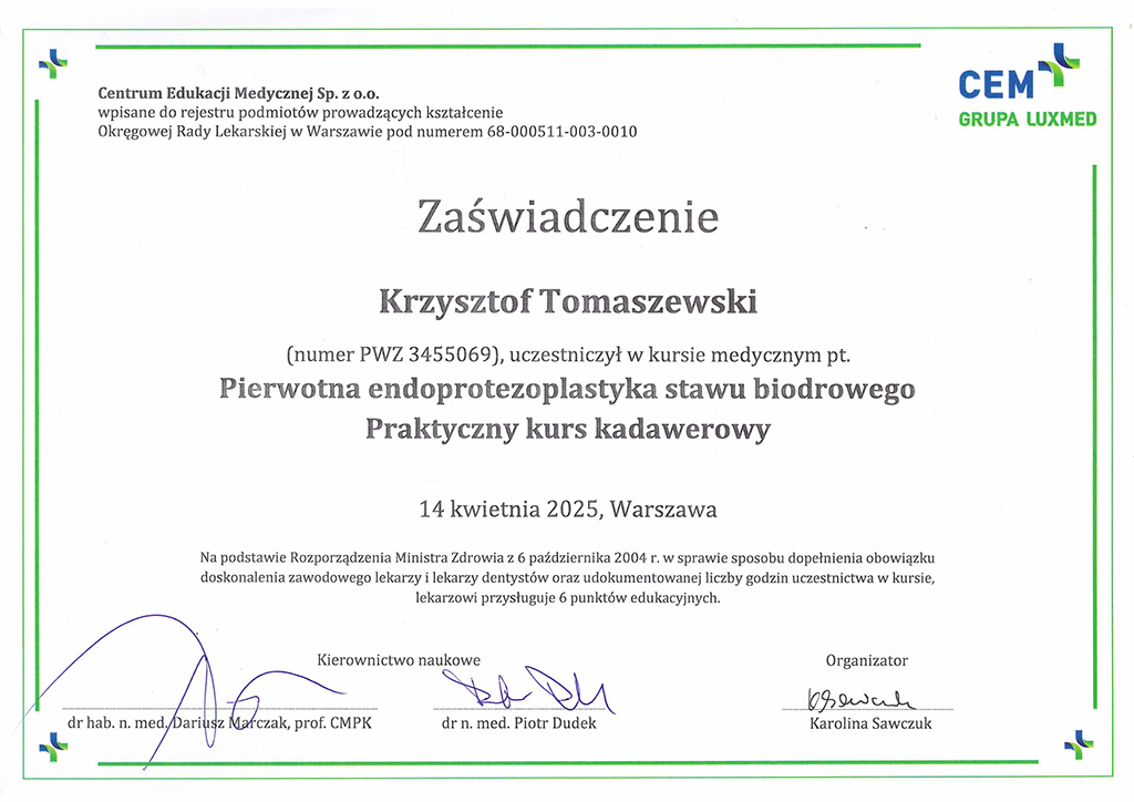 | 2011 | – specjalizacja II stopnia z Ortopedii i Traumatologii Narządu Ruchu |