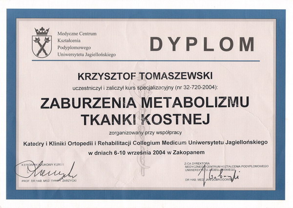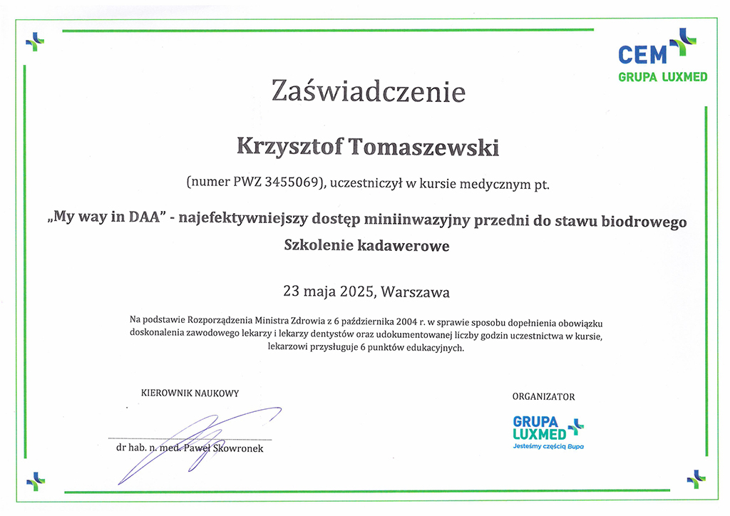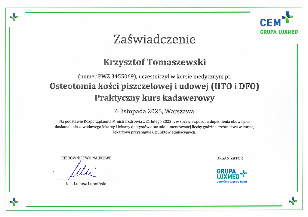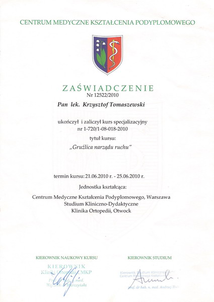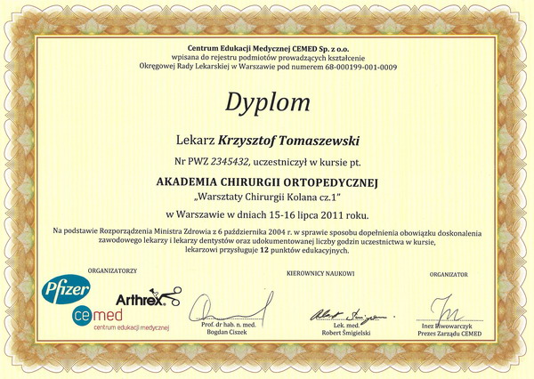 | 2011 | – specjalizacja II stopnia z Ortopedii i Traumatologii Narządu Ruchu |